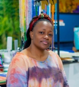 Oluwaseyi (Shayee) Awoyomi – Shayee is a multifaceted Nigerian artist, born into a family of visual and performing artists. She started at the tender age of three, dancing, singing, and doing textile and painting alongside her mother, Nike Okundaye. She has always found a way to infuse her artistic background and talent in every area of her life. She grew up in an artist village and can remember vividly following her mother to different textile markets in search of unique Adire cloths. Shayee derives energy from the patterns in the traditional Adire of the Yoruba people, carrying on their unspoken communication language patterns in all of her works.