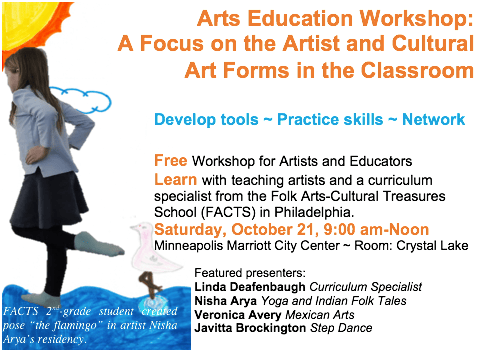 Minnesota artists, educators, and attendees of the the American Folklore Society meeting are invited to a hands-on professional development opportunity to deepen artists’ teaching strategies on Saturday, October 21, 2017. Participants will focus on the relationship of learning goals, instruction, skills building, and assessment. Folklife Education Specialist Linda Deafenbaugh and three artists of the Folk Arts-Cultural Treasures School (FACTS) in Philadelphia, awarded the Blue Ribbon School designation in 2016, will lead instruction.